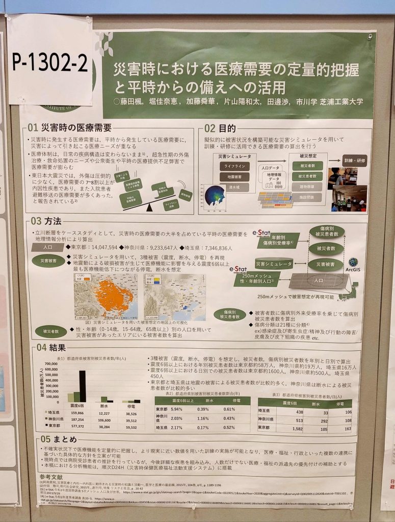 1日目は,自分たちのポスター発表がありました.研究室からは3題の連名発表で行われ,「災害時における医療需要の定量的把握と平時からの備えへの活用」というタイトルで私も少しだけ発表させていただきました.内容としましては,研究室の先輩方が開発してくださった”仮装災害シミュレータ”を用い,被害状況からその地域での患者の推計を行いました.初めての学会発表で緊張してしまい,スムーズに喋れなかった気がします...口演発表とは違い,ポスター発表は見ている人たちとの距離が近く,先生や先輩方は聴衆の方を見ながら堂々と発表されていました.発表はこれから少しずつ慣れていきたいです...